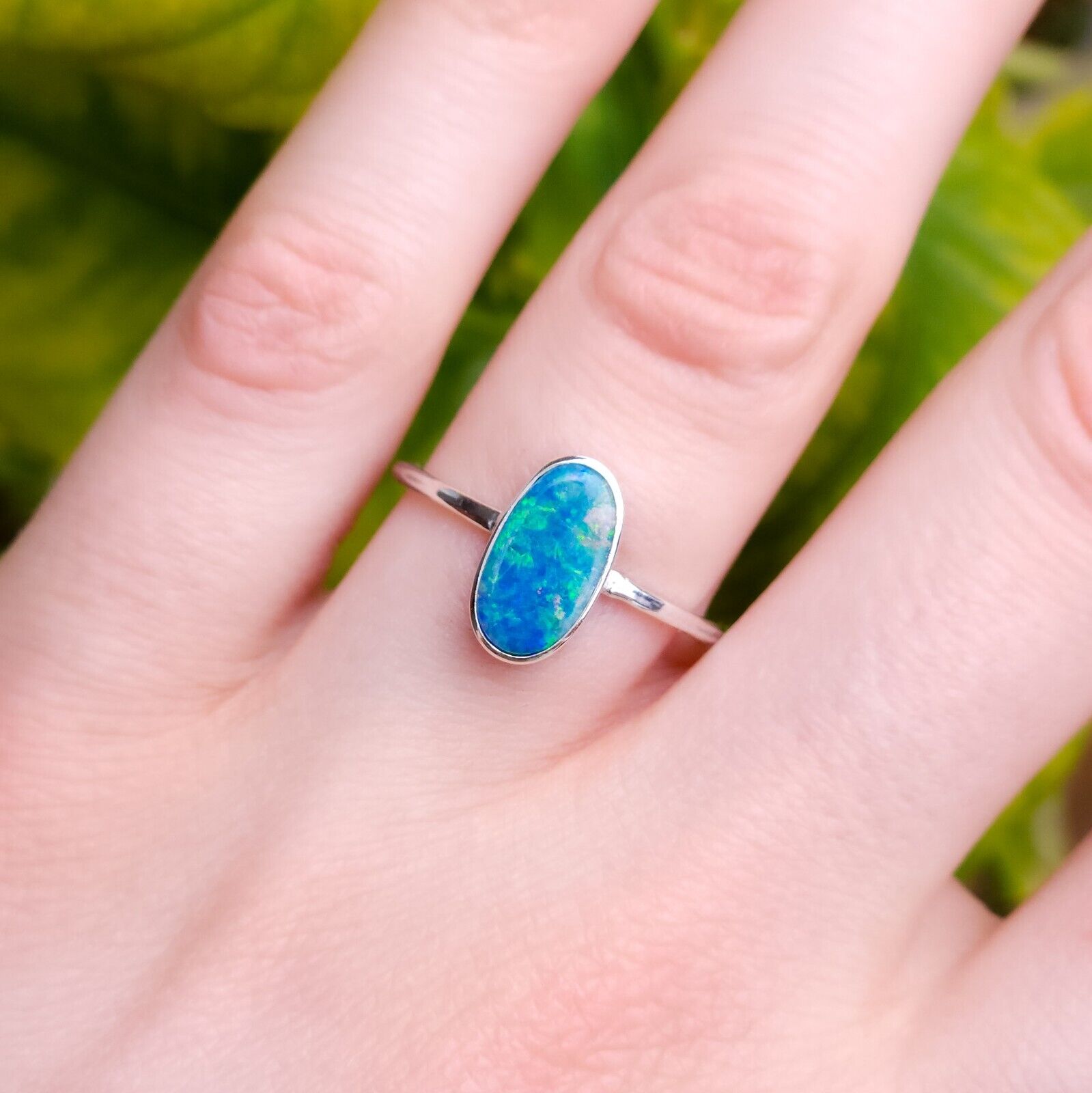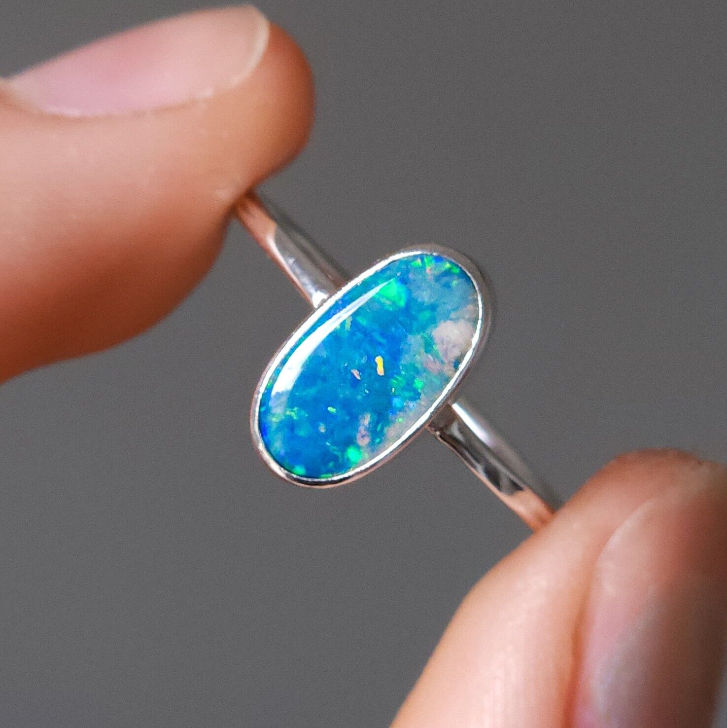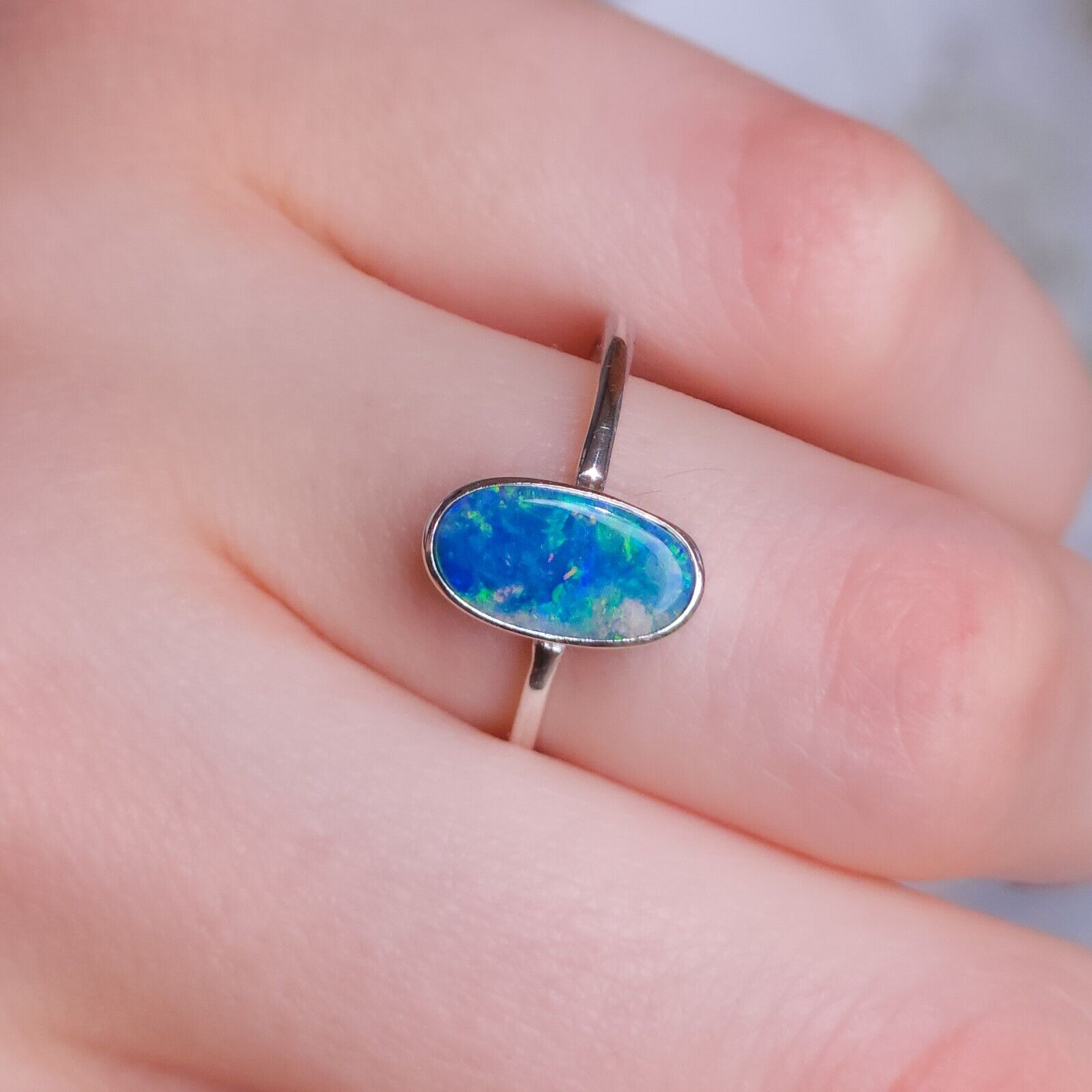 Australian opal doublet ring / SIZE US 7 3/4, Silver opal ring/ dainty Australian opal ring/ crystal opal ring/ blue green opal gemstone