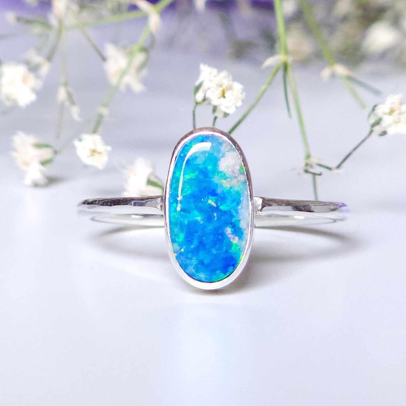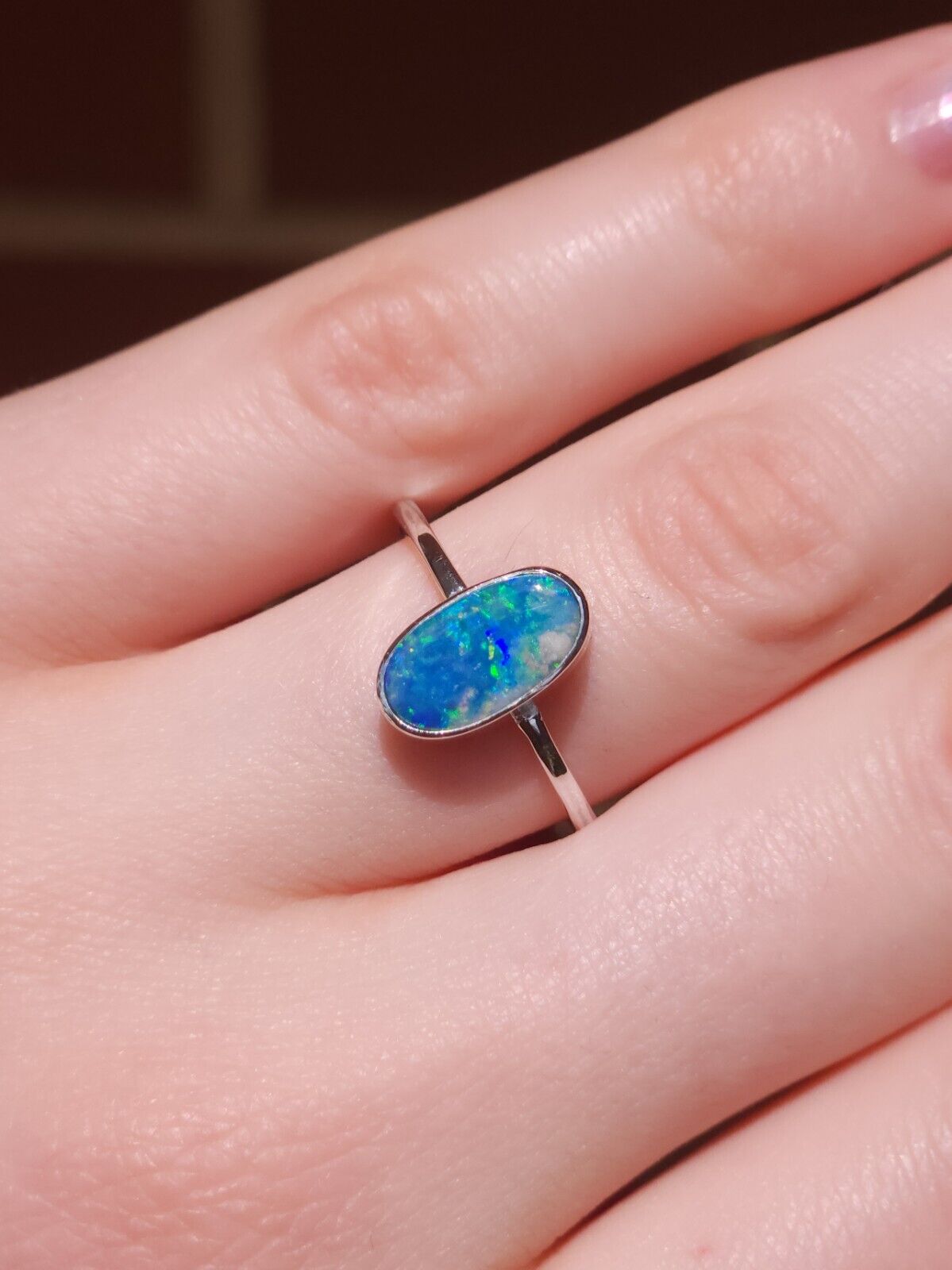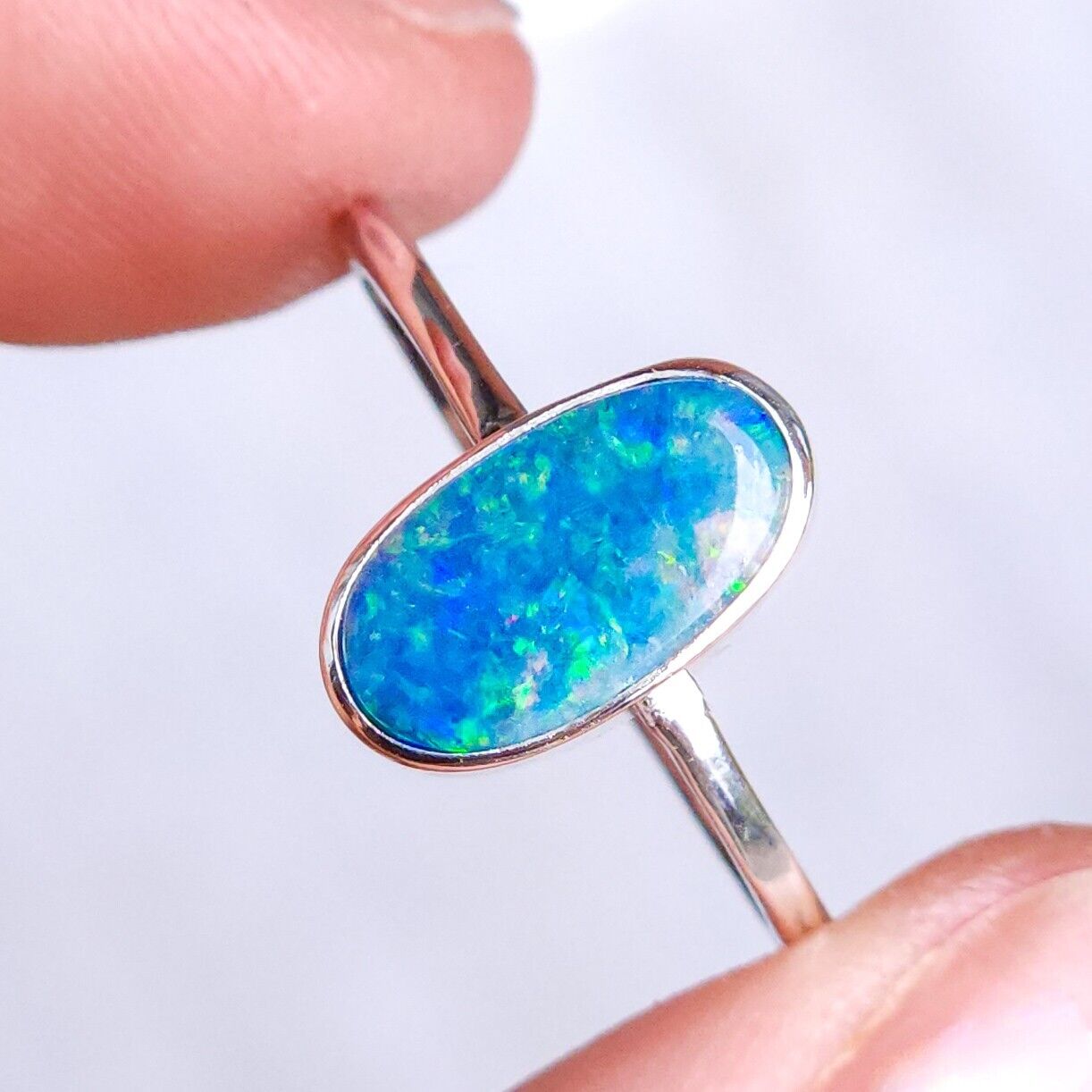 Australian opal doublet ring / SIZE US 7 3/4, Silver opal ring/ dainty Australian opal ring/ crystal opal ring/ blue green opal gemstone